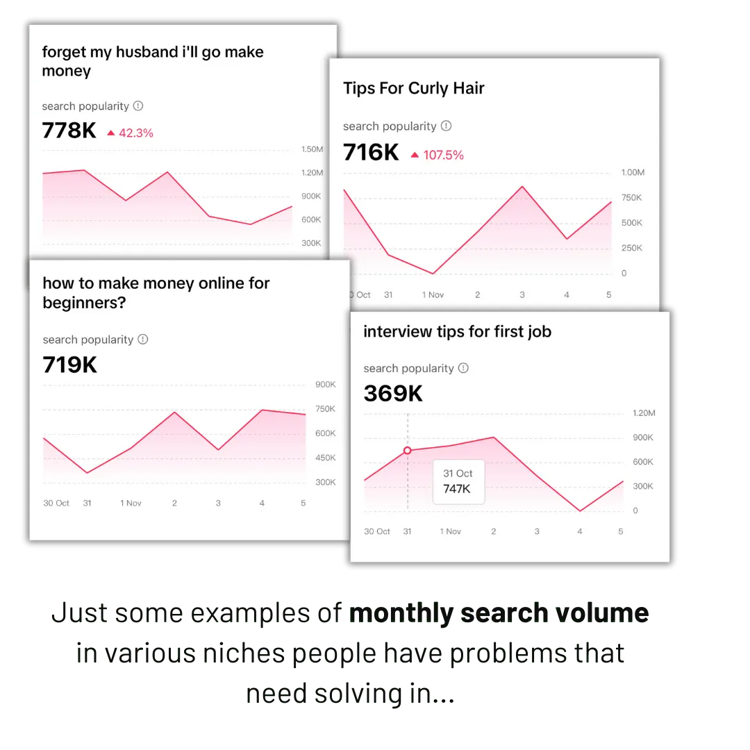 You're watch time completion goes crazy on the algorithms, they push it to more people who then click on your profile and 1-2% purchase your AI Asset with 100% margin (usually $17, $27 or $47+).
